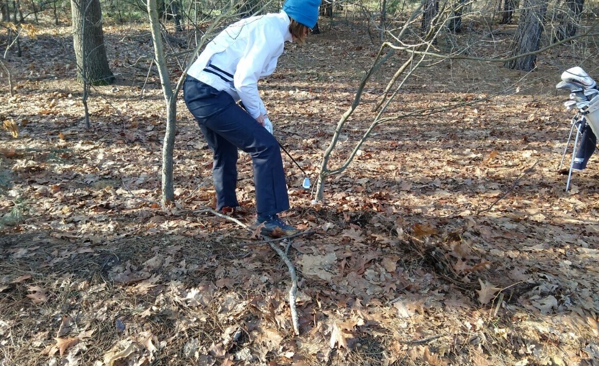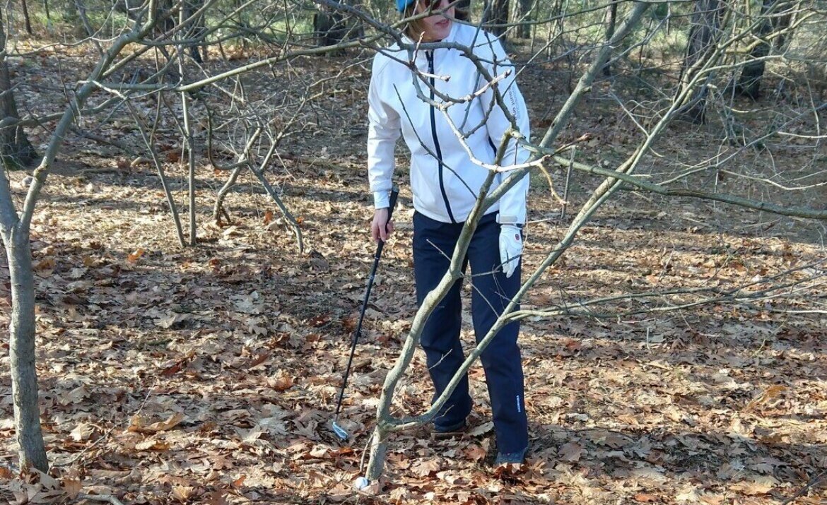 Onze enige vrouw van vandaag, Marloes, had het erg zwaar deze ronde. Van tee tot de green wilde het niet lukken. Gaande weg werd het wel iets beter, maar de lastigste positie waar ze zichzelf in heeft gebracht, was op hole 5. Zie de foto's. Je ziet de radertjes draaien in haar hoofd: Hoe kom ik in de minst aantal slagen uit deze situatie. Haar bal lag aan de rechterkant tegen een boomstammetje aan. Dat boomstammetje was te dik om als rechtshandige gewoon doorheen te slaan, dus moest het maar als linkshandige gebeuren. Bij de tweede poging ging de bal er prima uit. Zo af en toe heb je van die rondes waarin bijna alles tegen zit en je niet je beste spel kunt spelen. Dat hebben we allemaal, dat is ook golf! Volgende keer kan het zomaar weer anders zijn!