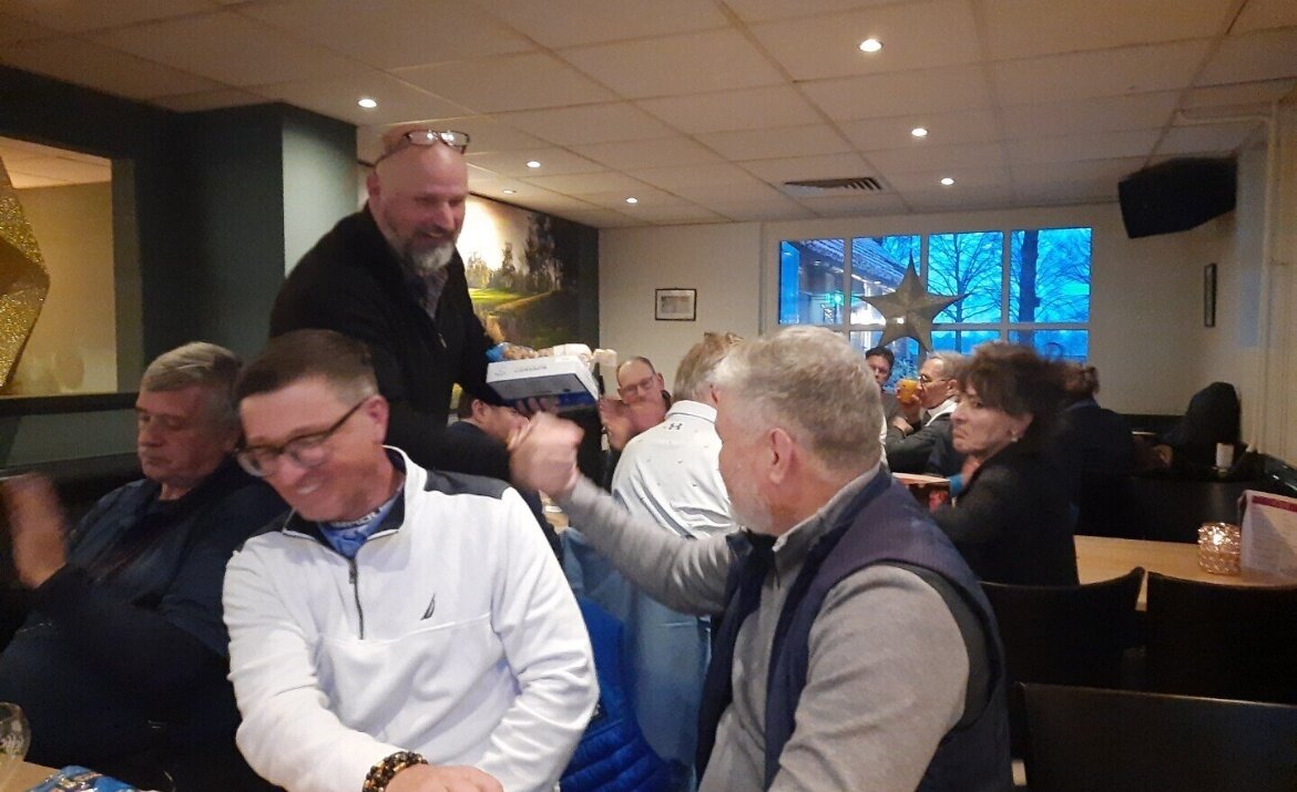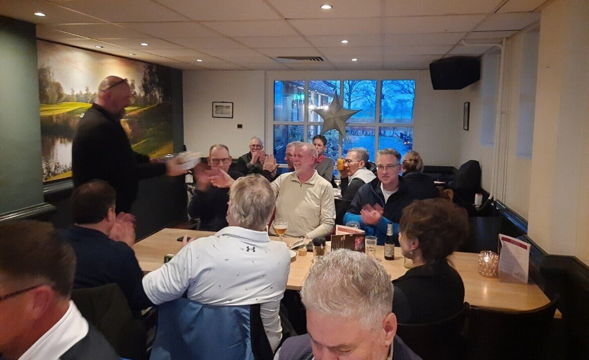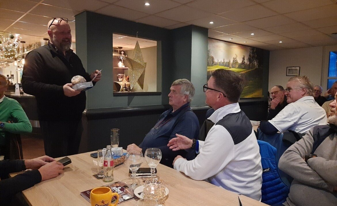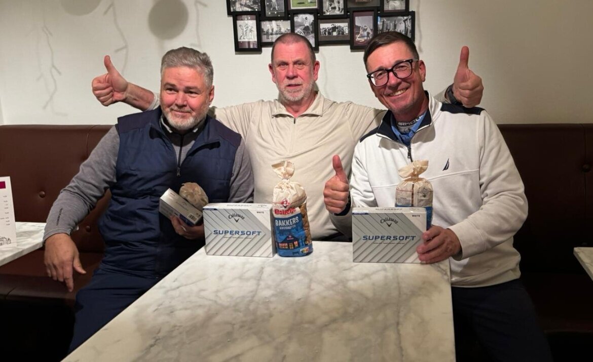 Net niet op het podium en buiten de prijzen dit keer, Pollie en Mladen met beide 75 netto. Prijswinnaars, verblijd met de gebruikelijke doos gloednieuwe GVN Callaway's en daarbovenop nog een kilozak vol kruidnoten uit het schoentje van Hans, waren: op de derde plaats met 74 netto Hans Brekelmans, op de tweede plaats Mimoun met een mooie netto score van 71, en de onbetwiste winnaar met een jaarvoorraad aan kruidnoten en een netto score van 69: Dirk!